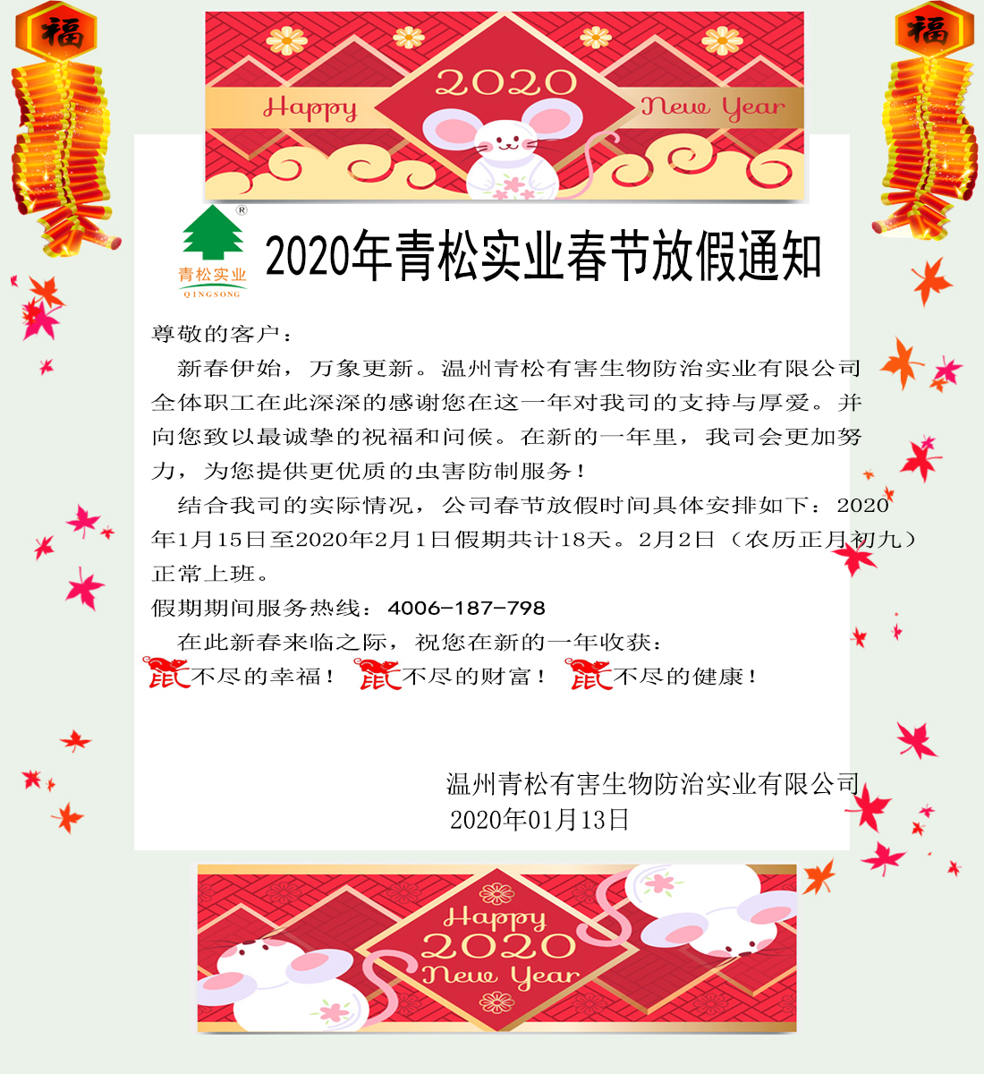 2020年青松實業(yè)春節(jié)放假通知