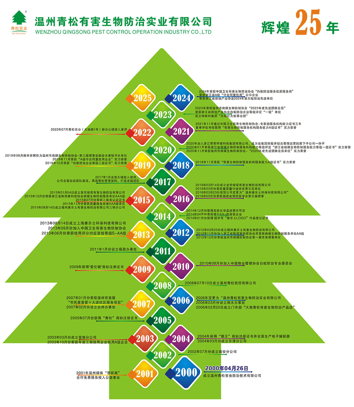 公司成立20年,立足于溫州地區(qū)及周邊城市,現(xiàn)公司在瑞安、蒼南、樂清、麗水、臺(tái)州、福鼎、福州、上海、南京、福州三明、金華等11處設(shè)分公司和辦事處,對(duì)各地區(qū)蟲害防制、城市創(chuàng)建服務(wù)做出長(zhǎng)遠(yuǎn)的貢獻(xiàn)。